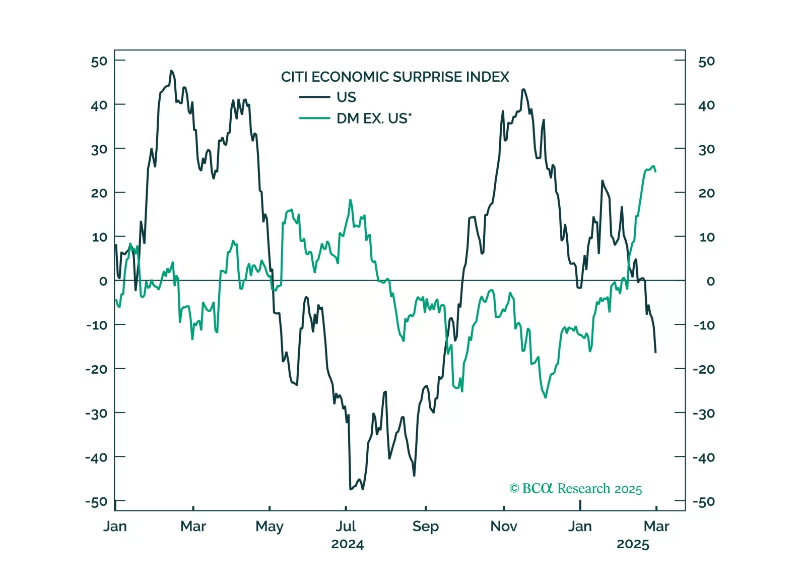 US growth has slowed in recent weeks. This can be seen in the weaker data on retail sales, consumer confidence, services PMIs, and a swath of housing releases (notably starts, existing home sales, homebuilder confidence, and stock prices). It can also be seen in the decline in GDP tracking estimates. The Atlanta Fed's GDPNow model projects growth of 2.3% in Q1, down from a peak of 3.9% on February 3. The Citi US Economic Surprise Index has also dipped into negative territory.