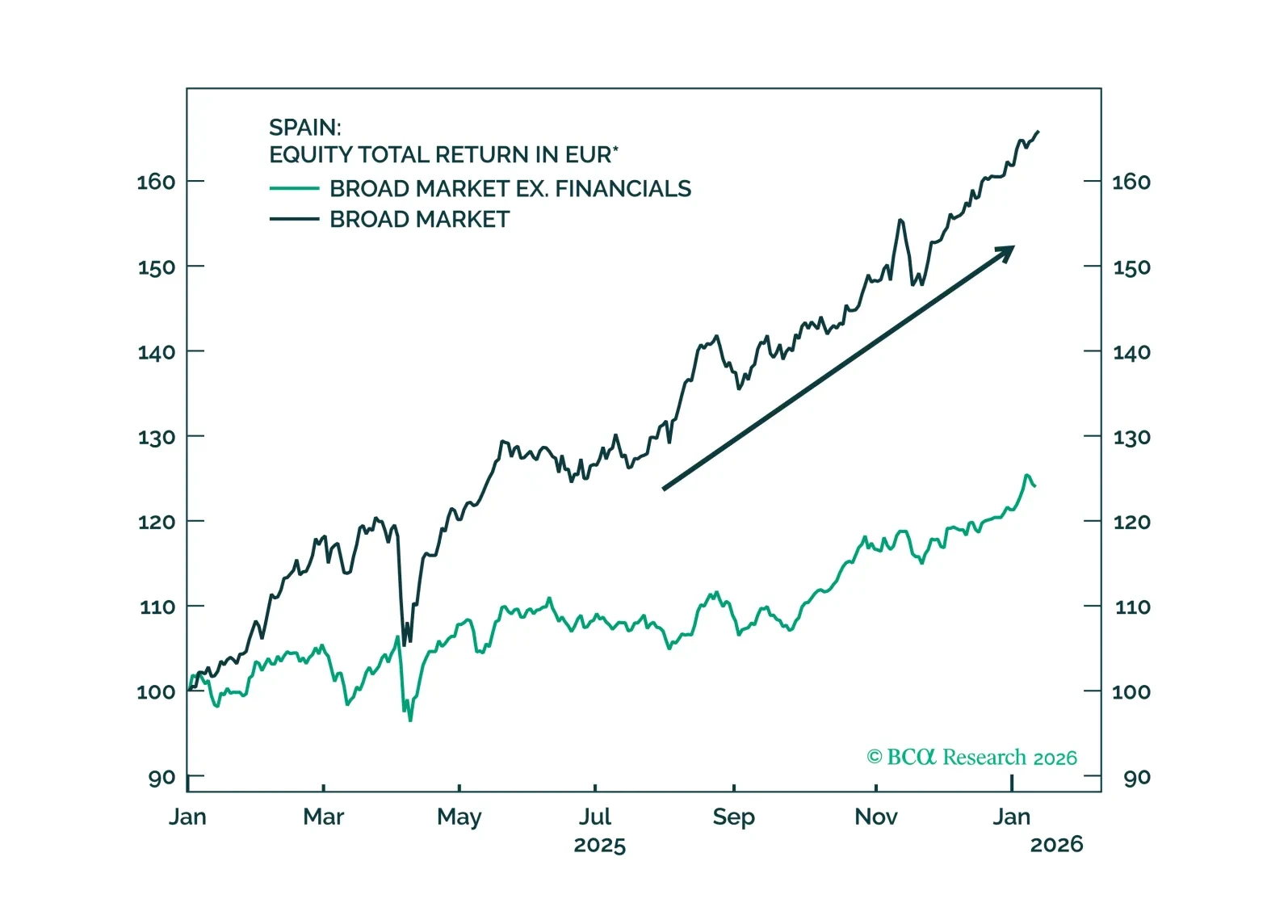 Spain's equity and bond outperformance reflects genuine fundamental repair: Lower bad loans, stronger profitability, and sustained earnings upgrades. Valuations remain undemanding despite the rally. Productivity is the key structural risk, but near-term fundamentals continue to surprise to the upside.