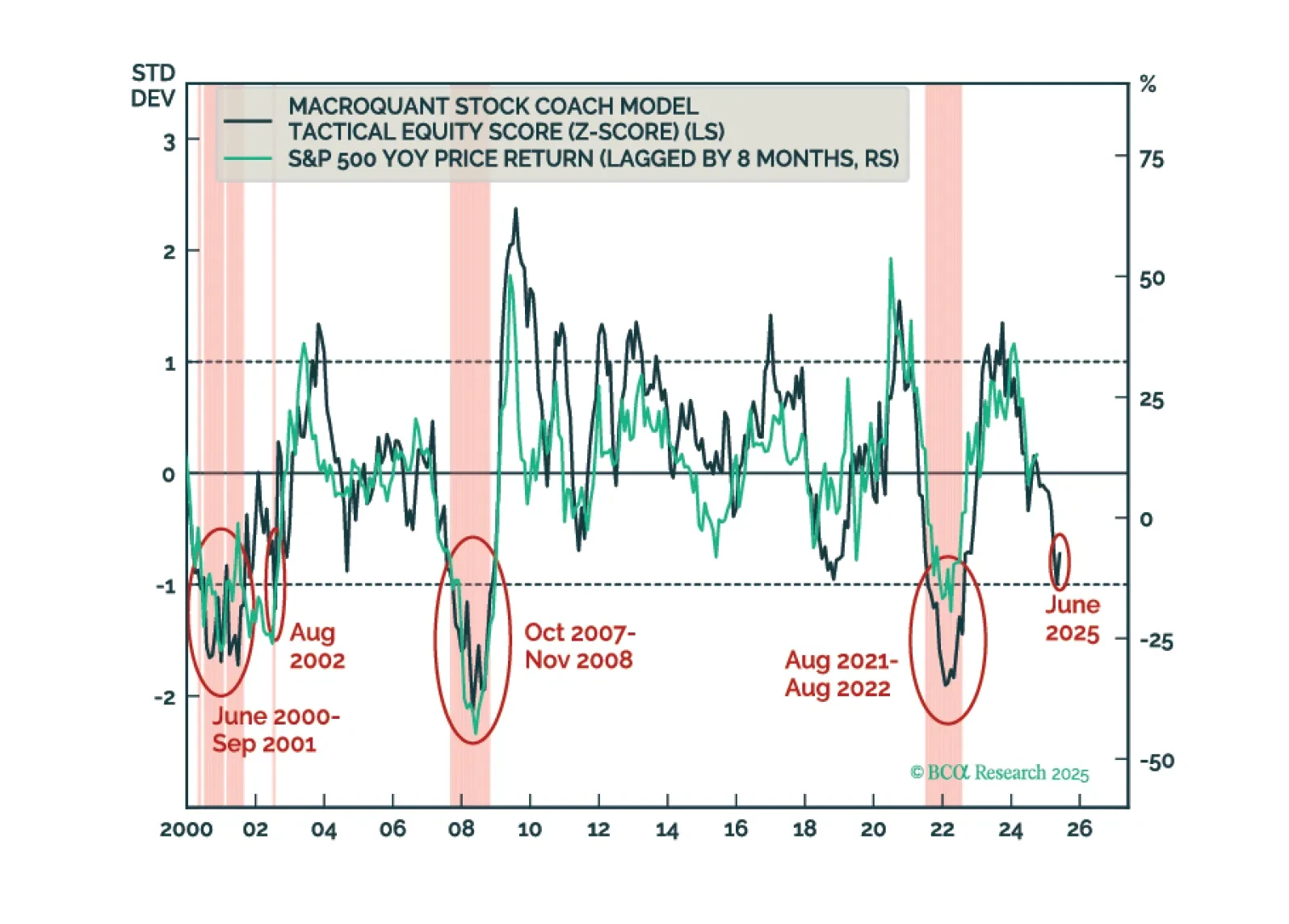 MacroQuant’s US equity z-score is dangerously close to the -1 threshold. Moves below that threshold have reliably coincided with equity bear markets in the past. As such, MacroQuant recommends an underweight on stocks, offset by an overweight on bonds and cash.
