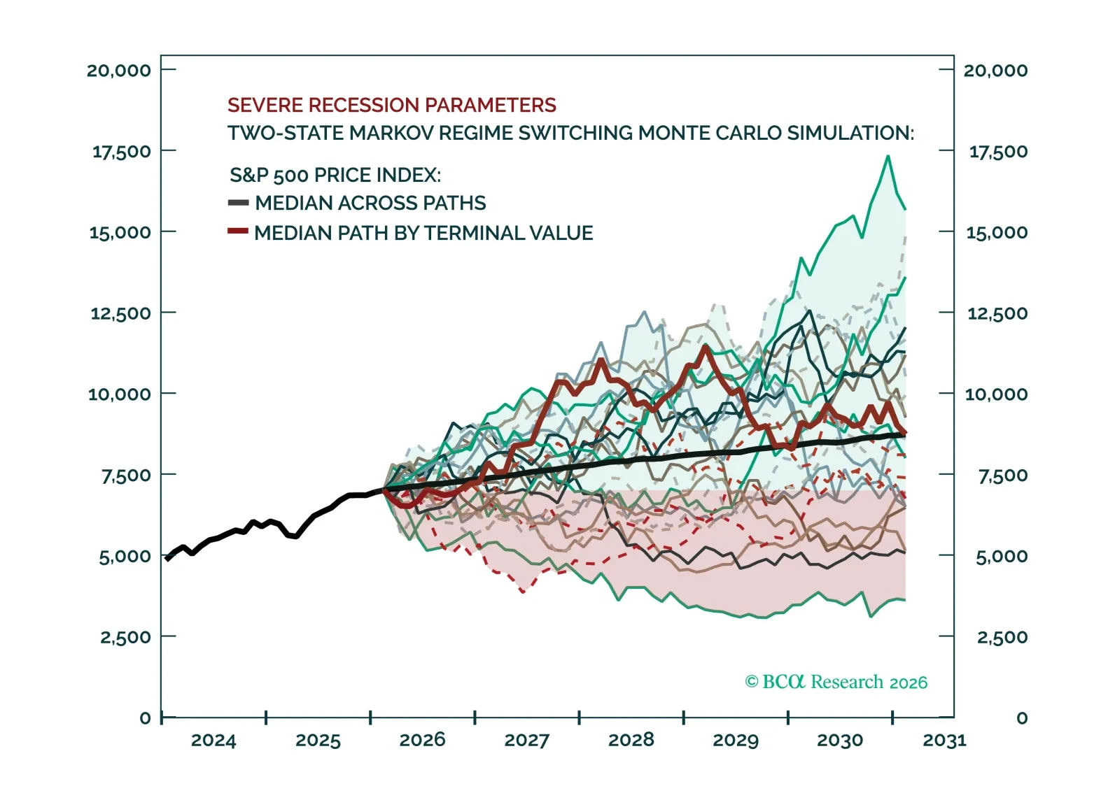 Recessions are inevitable but unpredictable. While earnings drive long‑term equity performance through the cycle, around turning points fundamentals follow a predictable sequence: multiples contract first, then prices, then earnings. Recessions can shift sector leadership, but simulations show that medium‑term index‑level upside remains intact unless future downturns are materially more severe than in history.