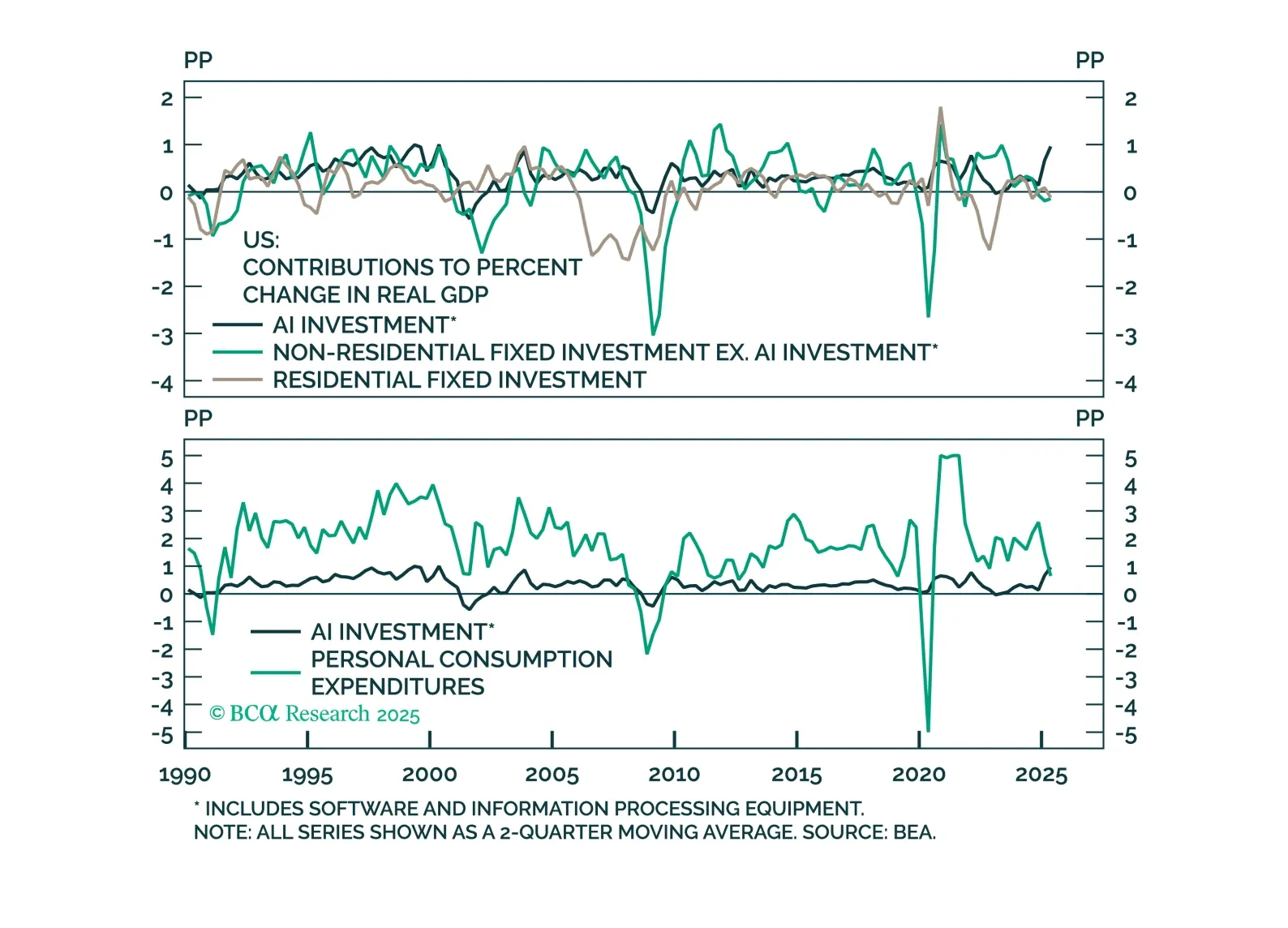 Over the first half of 2025, AI capex outpaced both consumption and all other investments in its contribution to US growth. Like all other capex cycles this one will end in tears. However, the indicators we track suggest that AI capex can continue supporting growth and markets for now. Remain Neutral on equities. Upgrade Health Care to Overweight and downgrade Consumer Staples to Neutral. Buy tail risk protection.