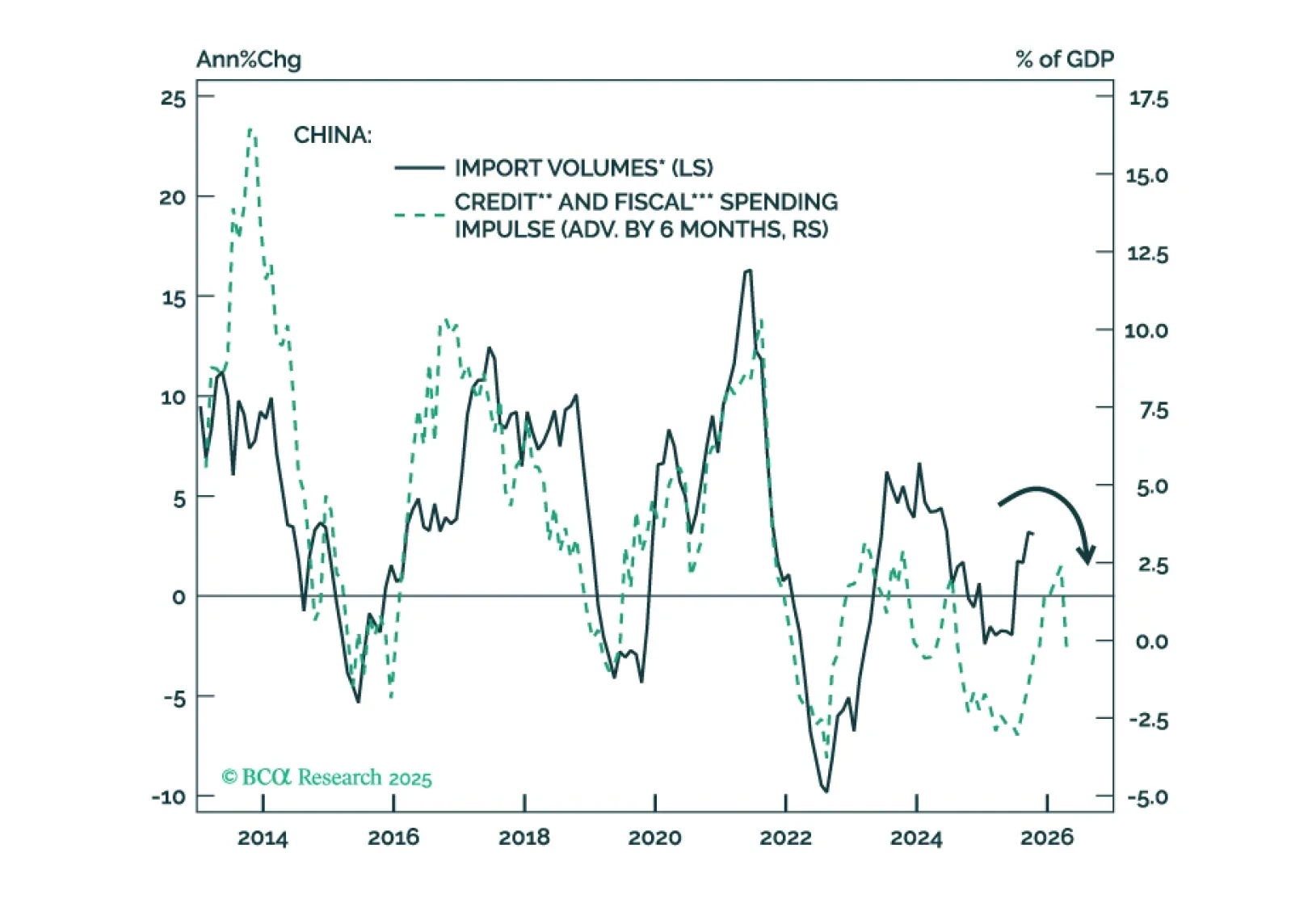 Risk assets in EM/China and cyclical commodities will sell off in H1 2026. A shift toward aggressive policy stimulus in China and a clear improvement in global manufacturing are needed to produce durable rallies in EM/China risk assets and the prices of energy and industrial metals.