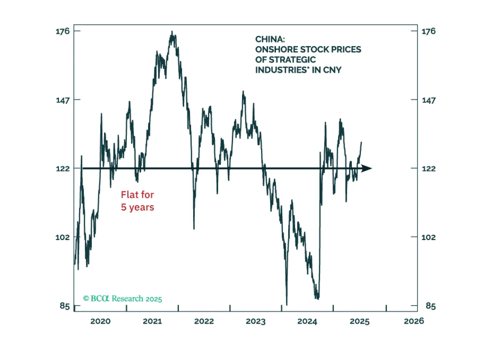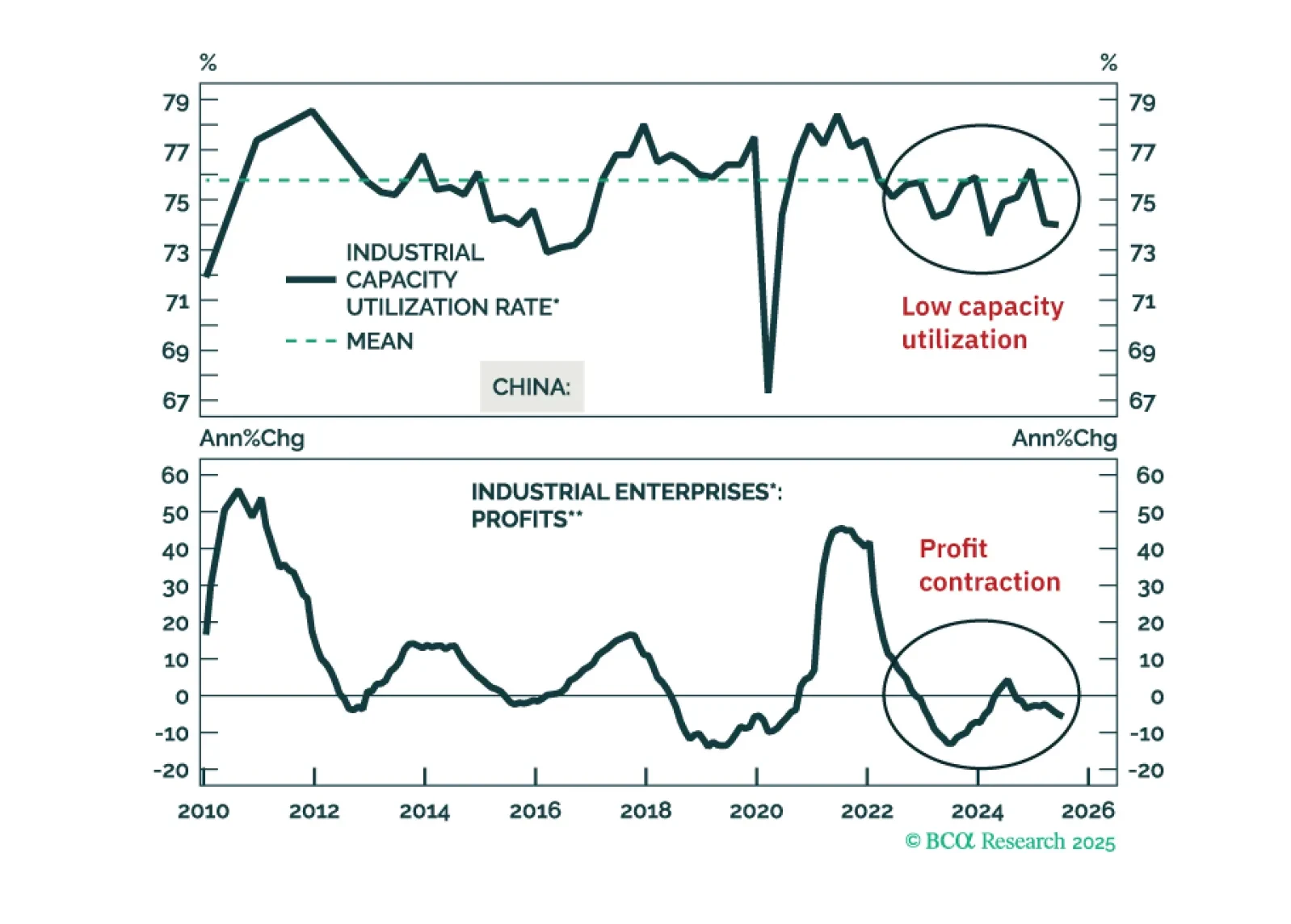 China’s policy-driven constraints prevent the “destruction” part of the creative destruction process. Instead, they entrench overcapacity, deflation, and poor profitability. We are reluctant to chase the rally in Chinese stocks in absolute terms.
