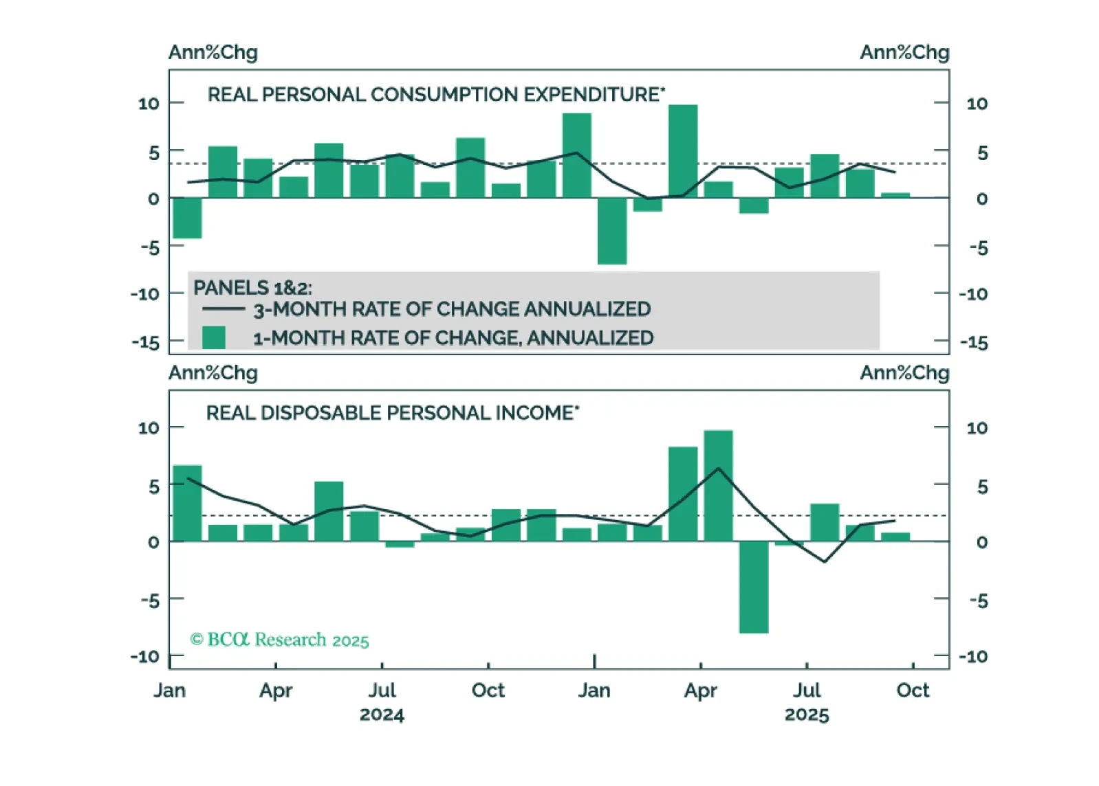 In Section I, Doug explains how the sharp upward revision to second-quarter consumption in the final GDP estimate has reduced our recession conviction and could lead us to abandon our recession call altogether. The situation is fluid, though, as typified by the striking weakness of stocks in consumer-facing and cyclically exposed subindustries. In Section II, Doug and Global Investment Strategy’s Miroslav Aradski consider the implications of the AI investment boom.