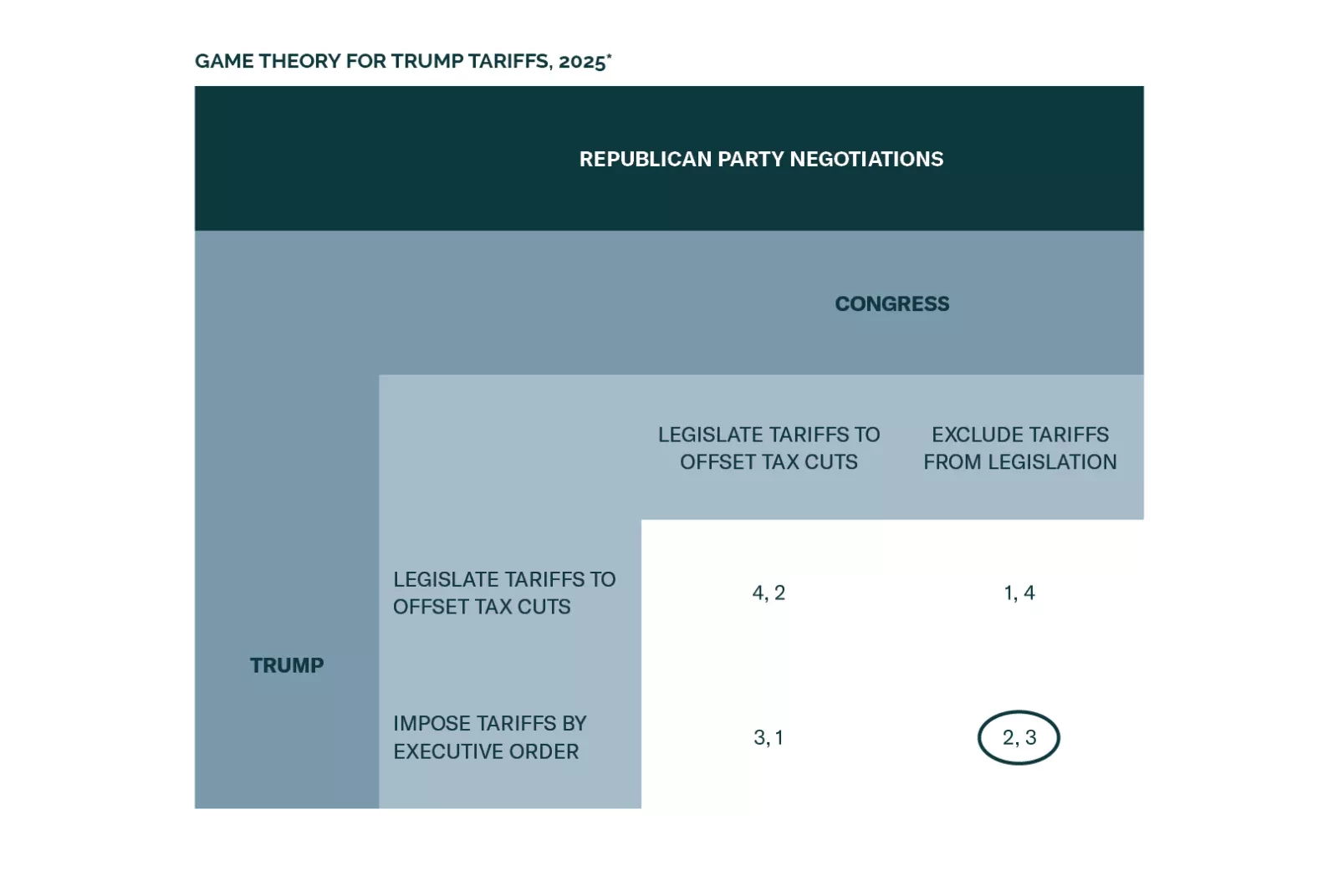 Simple games allow us to model several of the Trump administration’s most disruptive policies in 2025. We find that markets face an increase in volatility as Congress expands the budget, Trump implements tariffs on the world, China retaliates, and Taiwan tensions persist. A ceasefire in Ukraine is a marginally positive outcome for Europe, although it is not a long-term peace treaty.
