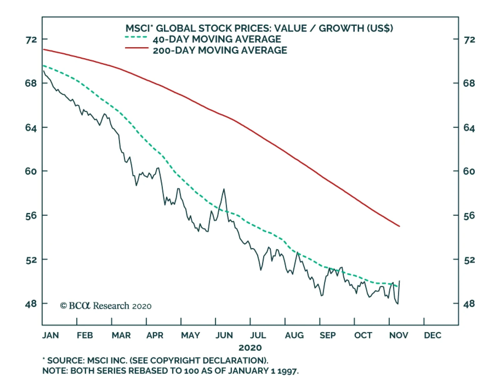 Highlights The vaccine promises an eventual return to “normal” life – just as Americans voted to “return to normalcy.” Markets are cheering and hinting at an eventual rotation into value stocks. The contested US election can still cause volatility even though Trump is highly unlikely to change the result. The fiscal stimulus cliff is still a risk to the normalcy rally in the short run. But gridlock is the best political outcome over the coming 12-24 months. Stay strategically long global stocks over bonds. Tactically maintain safe-haven positions, add risk gradually, and stay short China/Taiwan. Feature The news of Pfizer’s success in developing a COVID-19 vaccine galvanized financial markets this week. America’s leading public health official Anthony Fauci also predicted that Moderna’s vaccine candidate would be similarly effective. It will take time to distribute these vaccines but the world can look toward economic recovery next year. Stocks rallied, bonds sold off, and value outperformed growth on the back of the news (Charts 1A and 1B). Chart 1ABiden: Return To Normalcy
