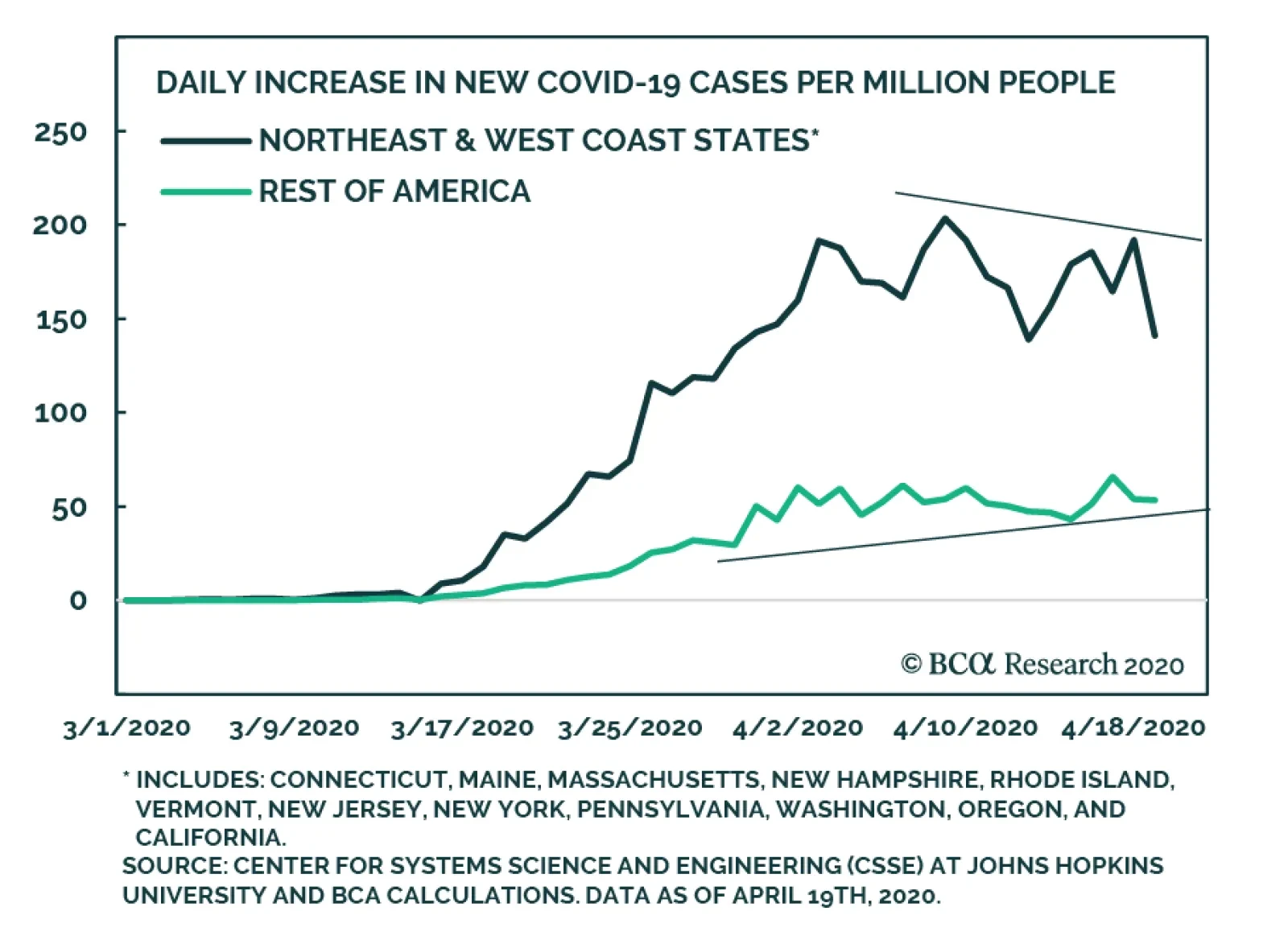 Highlights Over the past year we have discussed “peak polarization” for the United States with many clients. We have held the contrarian view that political animosities within the US are nearing their peak. Feature Prior to COVID-19 we argued that polarization would either peak this year, with the US election, or in roughly two years – a scenario in which President Donald Trump won reelection and an epic partisan battle ensued with House Democrats over his second-term policy priority (probably the southern border wall). The global pandemic and recession have changed things. They are accelerating the peaking process, as a domestic consensus is forming on Big Government, border controls, and protectionism against China. It is also less likely that President Trump will scrape through with a narrow victory in November – rather, he will win or lose decisively. Policy consensus and a decisive electoral outcome should reduce polarization in the coming years. The risk to this view is that President Trump is reelected for a second time without a majority of the popular vote and then attempts major cuts to social spending to correct the country’s gargantuan budget deficits. This risk is vastly overrated. A corollary of our view is that US polarization will hit a boiling point in this election year. Polarization will remain extreme until the election results are confirmed, settled, and done. The conflict between Trump and the Democratic governors over when to reopen the virus-plagued economy is case in point. For investors, this view implies that, in the very near term, the dollar and global safe-haven flows will remain strong, defensive plays have further to run, and US equities will continue to outperform global. But over the long run, the dollar is already at extreme highs and global equities outside the US offer better value. The COVID Confederacy When we chose our theme for this year’s presidential election, “Civil War Lite,” we argued that the US faced a host of social and political challenges that would come to head by November 3. These challenges could manifest in violent social unrest or in an electoral or constitutional crisis that harmed government legitimacy. We did not expect COVID-19, but it has created exactly what our Civil War Lite theme implies: a clash between federal and state governments over who has the final say in the American system. Specifically, the Democratic-led states on the east and west coast are quarreling with the Trump administration over how and when to reopen their economies in the wake of tough “shelter in place” measures that have ground the economy to a halt in order to stem the pandemic. For the first time since the great realignment of US politics in the 1930s, the US is having an historic nationwide crisis in which the Republicans are asserting an overriding federal government and the Democrats are insisting on states’ rights. United States governors have formed two coalitions to determine when and how to reopen. On the West Coast, California Governor Gavin Newsom joined with the governors of Oregon and Washington states to set up a working group. On the East Coast – the epicenter of the pandemic in the US – Andrew Cuomo, Governor of New York, joined with his counterparts from New Jersey, Massachusetts, Connecticut, Delaware, Rhode Island, and Pennsylvania to set up a similar working group. Governor Cuomo fought a war of words with President Trump over who has the authority to invoke and revoke emergency health and security actions. President Trump declared, “When somebody is the president of the United States, the authority is total.” Cuomo rebuked him by saying, “we have a constitution … we don’t have a king.” Trump replied by suggesting that Cuomo and his fellow governors were engaging in “mutiny” and implied that he could use his enormous powers and funds as head of the federal government to decide the conflict. The conflict between President Trump and the “COVID Confederacy” heightens uncertainty in the near term. All parties have since softened their tone. Cuomo said he did not want confrontation, President Trump said that he would “authorize” all fifty governors to reopen their economies, and Newsom asserted his executive authority over California without addressing Trump’s comments directly. This conflict may be overrated from the point of view of long-term American stability – President Trump is not about to impose a naval blockade like Abraham Lincoln. But it is not overrated in the near term for financial markets. That is because the reopening plan remains undecided. The “COVID Confederacy,” as we facetiously call it, makes up a combined 38% of US gross domestic product (Table 1), which is shown here in our flow-based cartogram of the United States (Map 1). Each state is colored red or blue according to its Republican or Democratic Party Electoral College vote in 2016, and it is sized proportionally to its economic output. Map 1The COVID Confederacy: States That May Break With Federal Government Over Quarantines