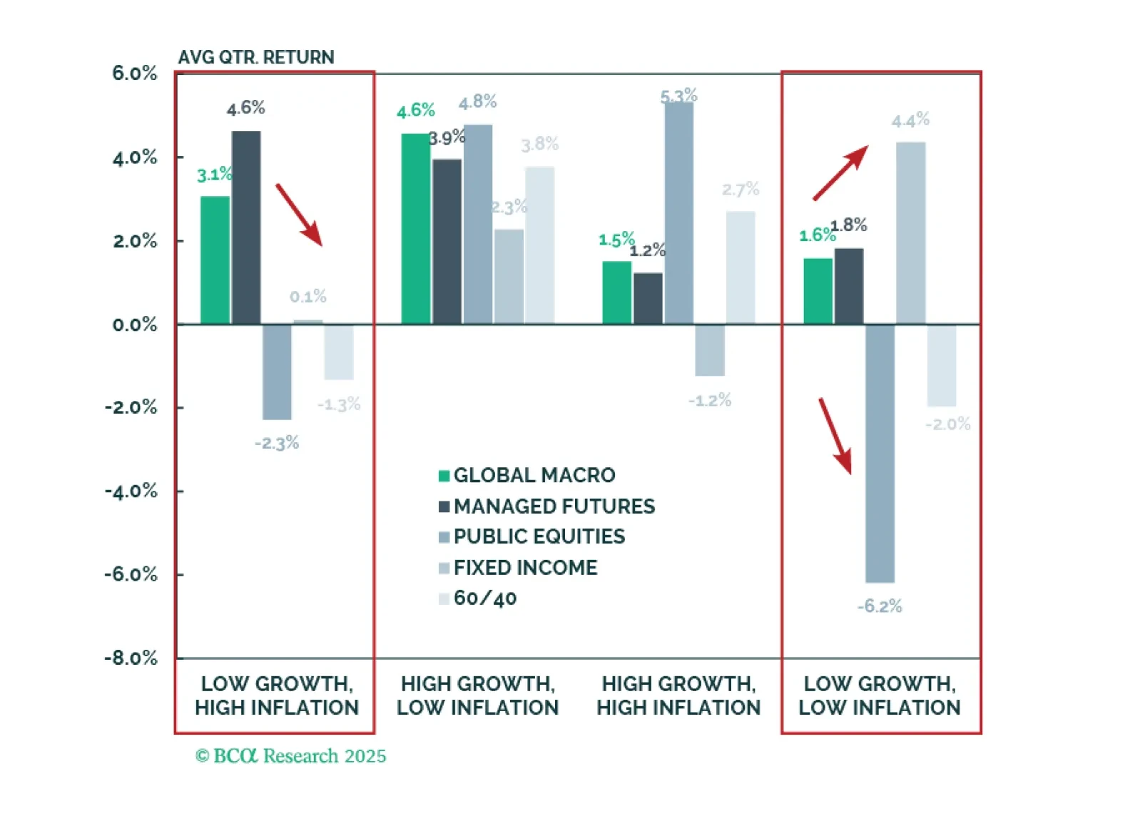 Understanding asset performance across Growth and Inflation regimes helps investors construct and manage balanced portfolios. Our first G&I Catalog report examines Hedge Fund strategies. Global Macro and Managed Futures offer the strongest protection in Stagflation-like periods, when traditional assets typically struggle. Since 1998, these regimes have occurred less than 10% of the time—but that may not hold true going forward.