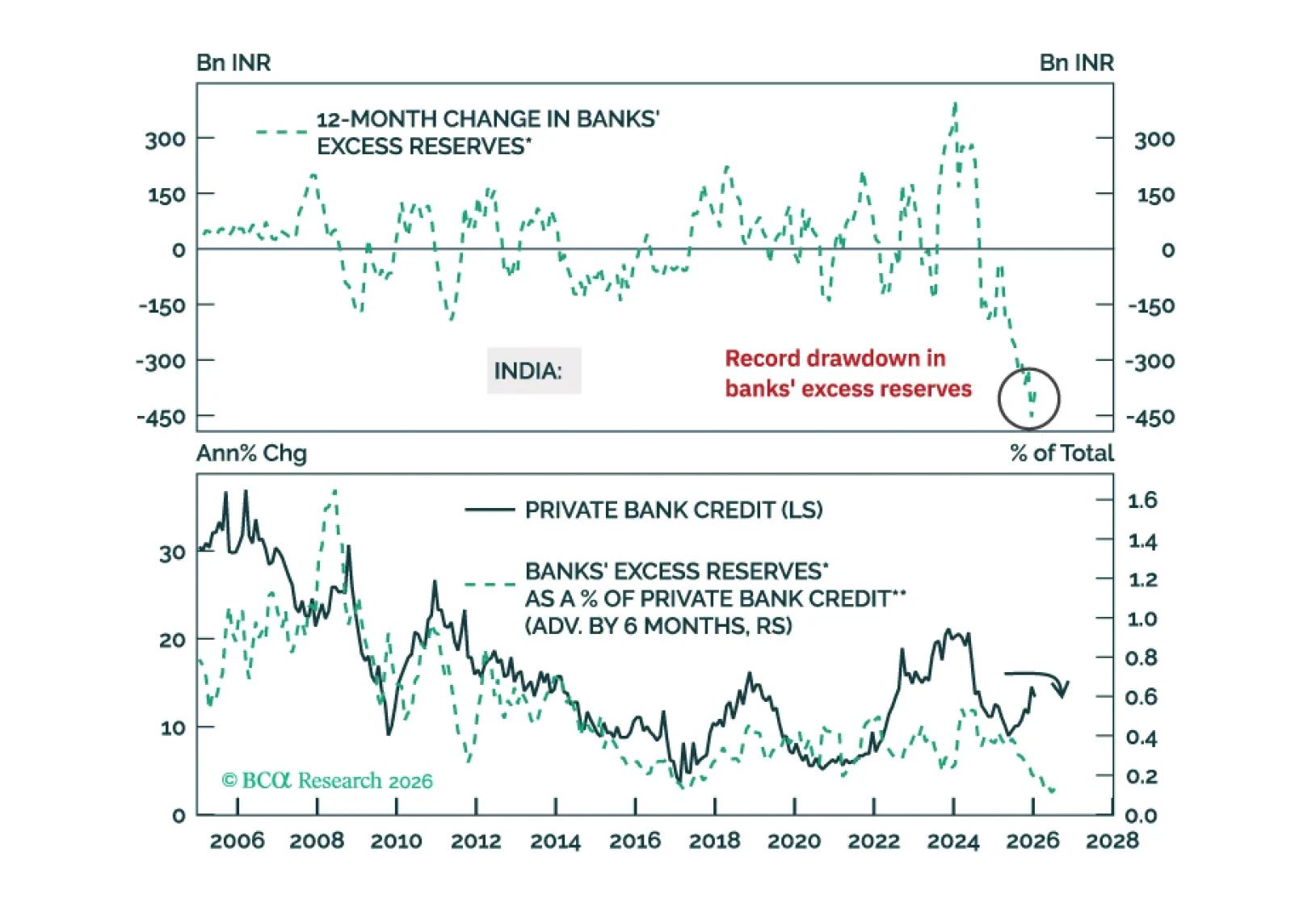 India is seeing net capital outflows for the first time in a generation. The central bank is selling foreign reserves to defend the rupee, which is draining banking system liquidity. The latter risks derailing the nascent credit revival. Indian stock prices remain vulnerable.