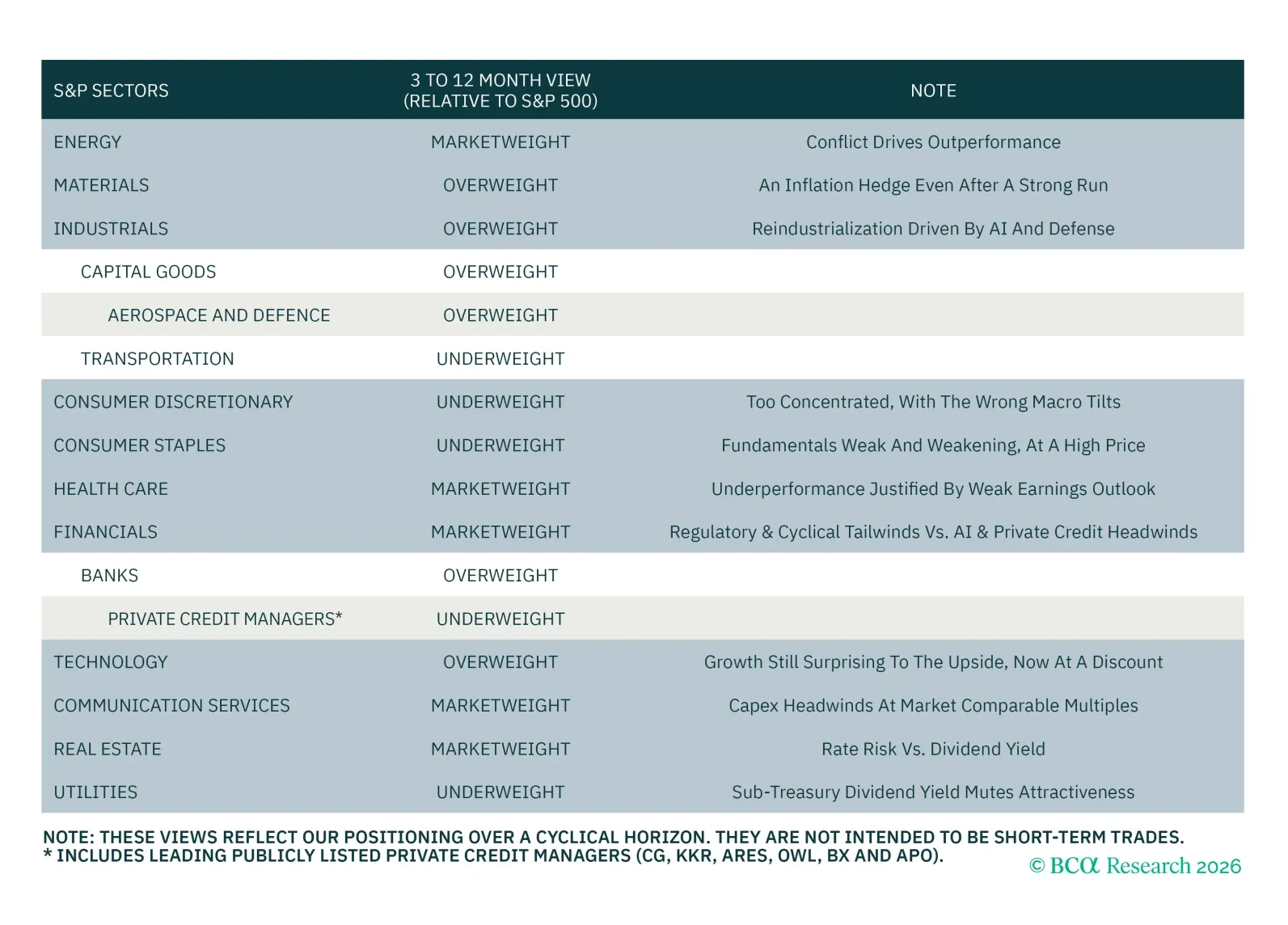 We expect the S&P 500 to deliver $308 of EPS in 2026, with a year-end target of 7700. Revenue growth drives upside, with little margin or multiple expansion. With economic growth tilted toward investment, we are overweight Technology, Industrials, and Materials, market-weight Financials, Energy, Health Care, Communication Services, and Real Estate, and underweight Consumer Staples, Consumer Discretionary, and Utilities.