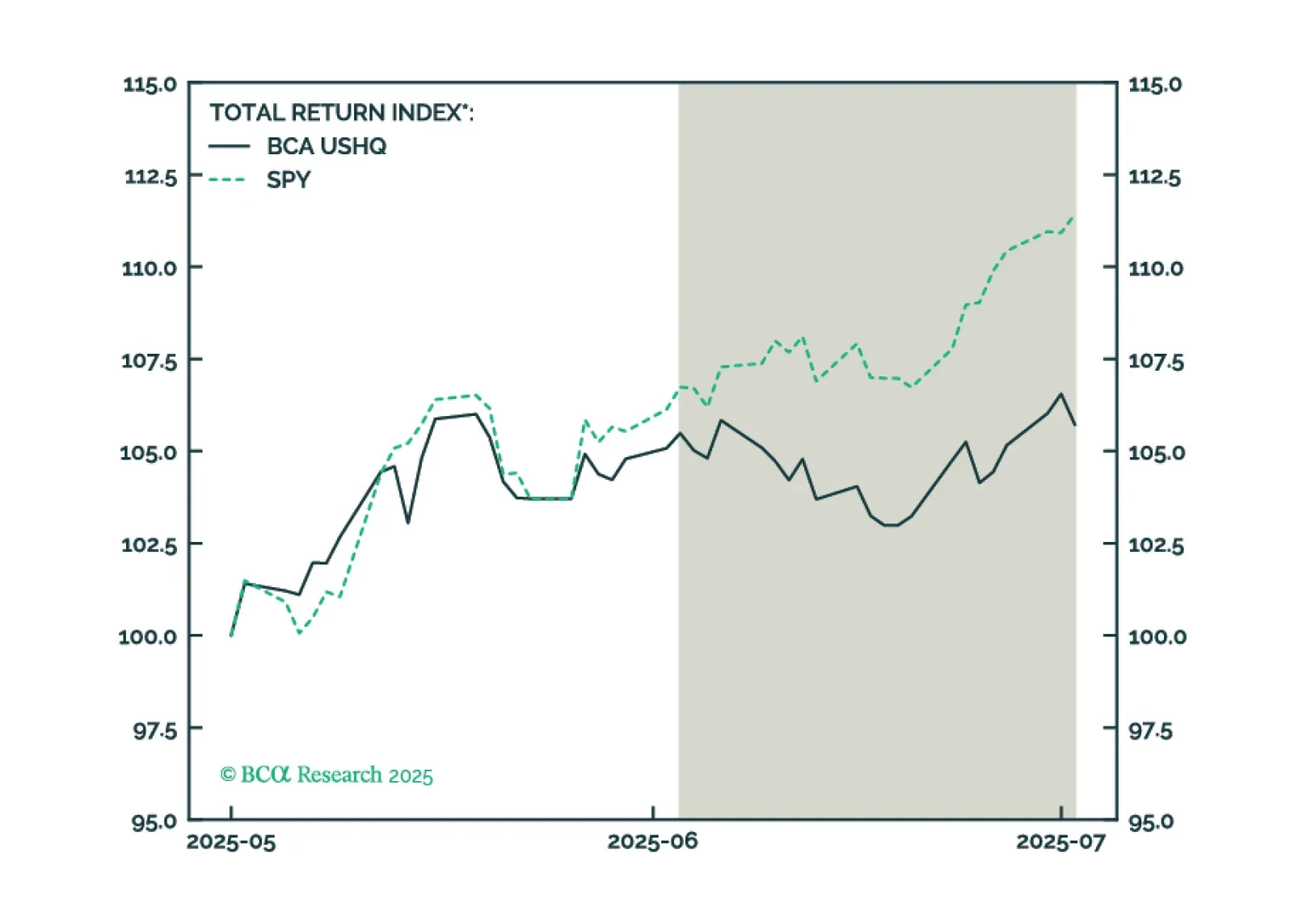 The US High Quality (USHQ) portfolio underperformed its benchmark through June, returning 1.2%, whilst its SPY benchmark returned 5.1%. On a trailing three-month basis, performance was notably weak vs. benchmark, with USHQ underperforming by approx. 600bps.