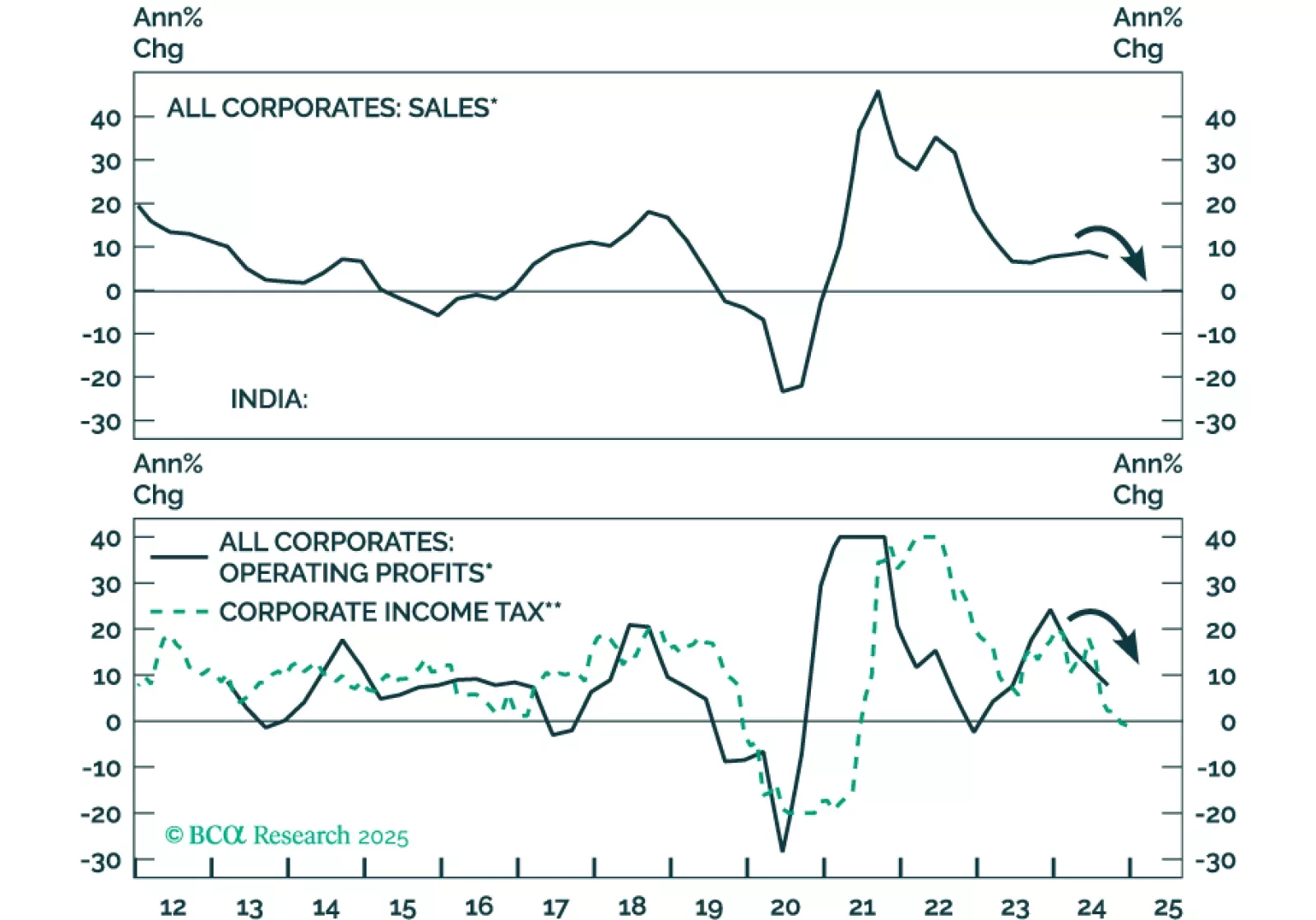 This is a cause for concern, as it’s nominal growth, rather than real growth, that determines profits and stock price growth. The bottom line is that persistently tight fiscal and monetary policies are hurting India’s domestic demand, and, hence, the nation’s business cycle. Profits Are Set To ContractIndian corporate earnings will likely contract as persistently tight monetary and fiscal policies will continue to hurt firms’ topline growth and margins. Given the still very high equity valuations, profit disappointments will extend the selloff in this bourse.RBI's compilation of 2900 companies shows that the nominal sales growth rate slowed to 6.6% as of September 2024, the latest figures available. Operating profit growth slowed to 4.5%.Profits have likely slowed further since then – as borne out in corporate income tax payments, which turned negative in the 12 months to December 2024. Historically, corporate tax payments have been a good gauge of firms’ sales and profits. Negative growth in corporate tax payments foreshadows shrinking corporate earnings (Chart 10).Profit margins will fall, as decelerating revenue growth will hurt margins due to operating leverage. Falling margins usually dampen stock multiples (Chart 11). Thus, both drivers of Indian stock prices, corporate earnings growth, and margins, have a negative outlook.