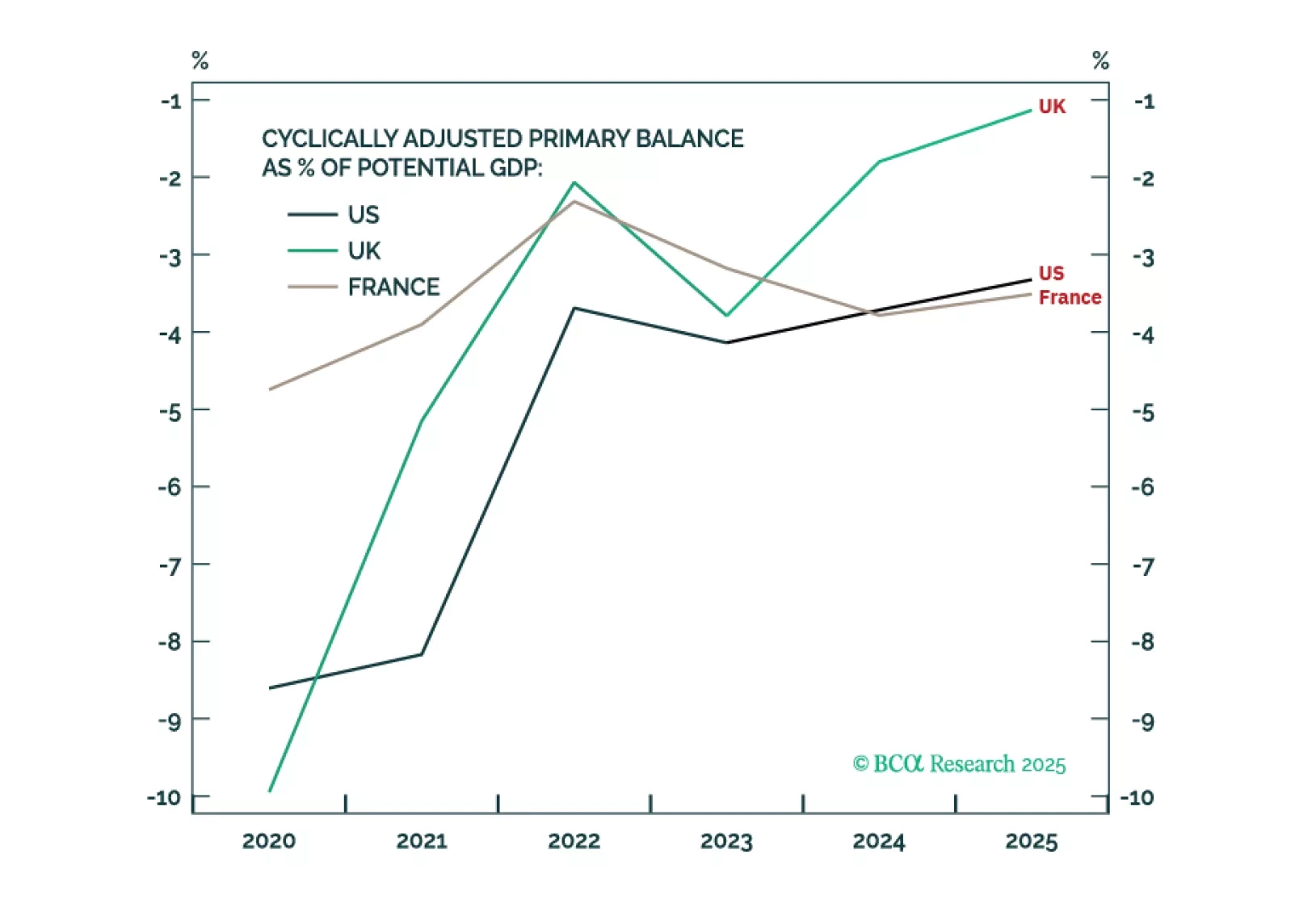 Political instability combined with the maths of debt sustainability is much more concerning in France than in either the UK or the US. Go long UK gilts versus French OATs and go tactically long GBP/USD.