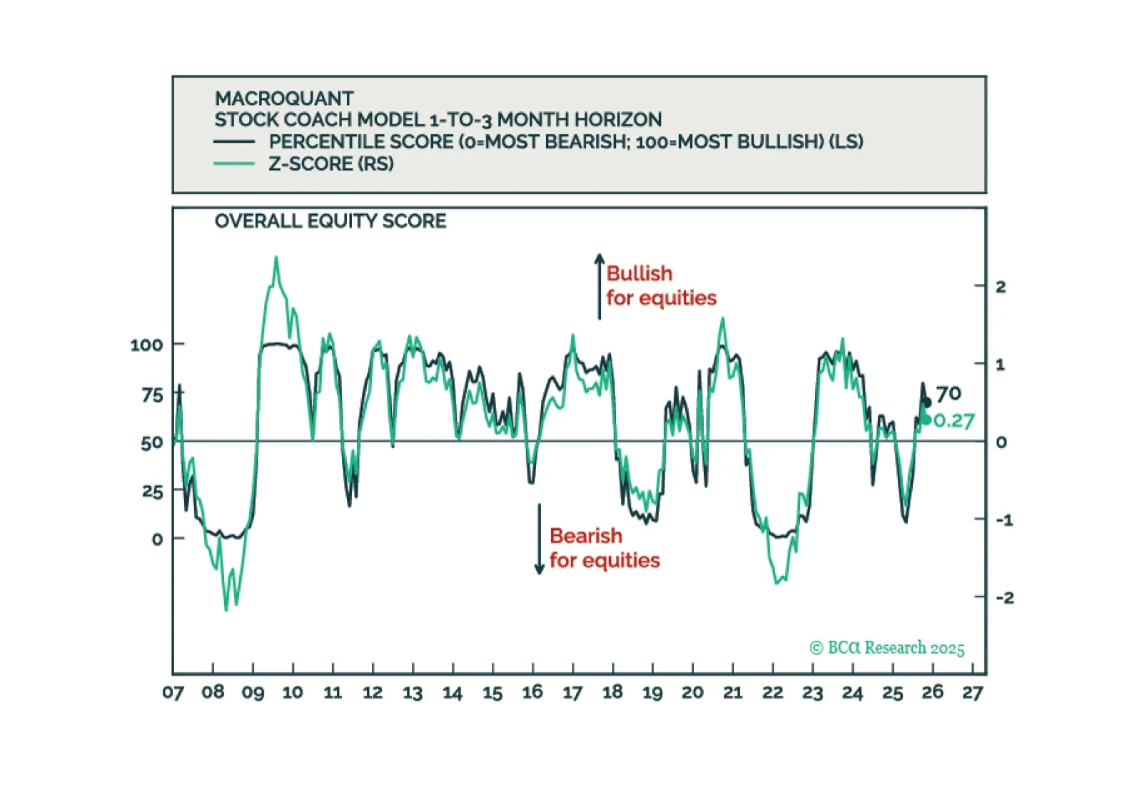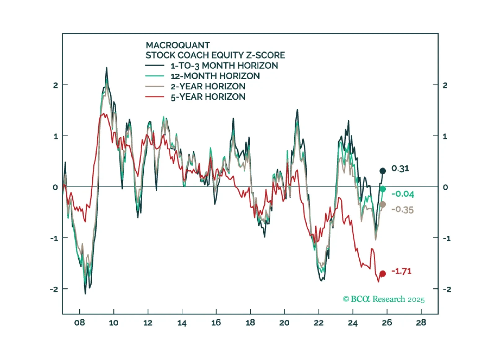 MacroQuant is tactically overweight equities, favors an above-benchmark duration stance in fixed-income portfolios, remains bearish on the US dollar, and is bullish on gold and copper.