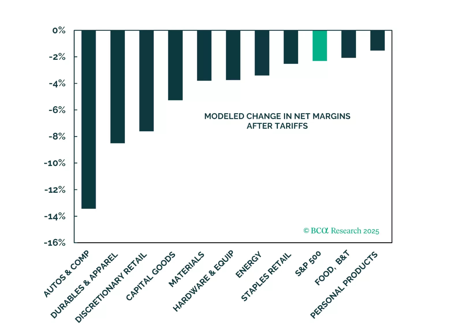 We have run a quick analysis to estimate the effect of higher tariffs on each sector's profit margins. We model an increase in COGS. We include the table of our calculations in the appendix. We used the following rules:We assume that only industry groups in the “goods” category are affected by the tariffs. Industry groups currently exempt from new tariffs, such as Hardware and Equipment and Pharma, will not see a tariff-related increase in COGS. We also apply industry-specific tariffs such as a 25% tariff rate on steel, aluminum, and cars.Half of all COGS of the “goods” industry groups will be affected by the tariffs. We estimate the increase in the 2024 tariffs by calculating a weighted average tariff rate for China and the rest of the world, based on the source of imports. “Rest of the world” countries are assigned a 90-day exemption rate of 10%. New tariff rates on China are pegged at the 54% pre-retaliation rate: A 145% tariff rate on Chinese goods will choke off all trade with China and is non-sustainable. We expect a negotiation and a bilateral agreement.Our analysis indicates that once these rules are applied, the S&P 500 net margin will decrease from 13.4% to 11.2%, which is a 2.2% margin squeeze. Industry groups within the Consumer Discretionary sector, such as Auto & Components, Durable Goods, and Retailing are most exposed (Chart 20). In our earlier analysis of the Fair Value PE NTM, we assumed that, based on our model, if the operating margin declines by 2%, the FV PE will decline from 19x forward multiple to 17x (Table 2).
