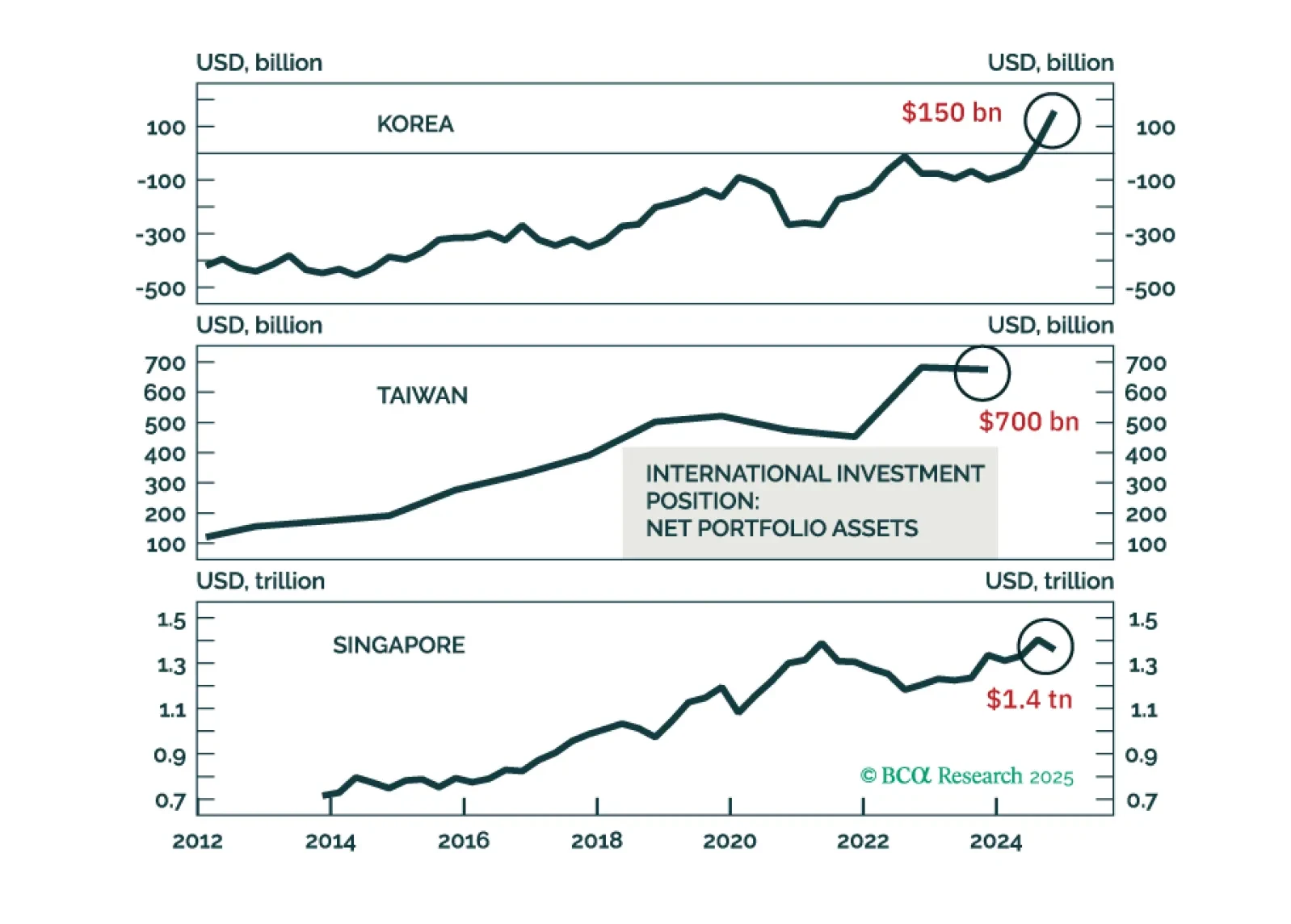 Taiwan, Singapore, and Korea's currencies might appreciate versus the USD, driven by capital repatriation from domestic private investors away from the US. This thesis is less pertinent to India, Indonesia, and the Philippines because they have large net foreign portfolio liabilities. Malaysia and Thailand fall in the middle, while China is an exception. Investors should play intensifying deflationary pressures in Asia by betting on lower interest rates in the region.