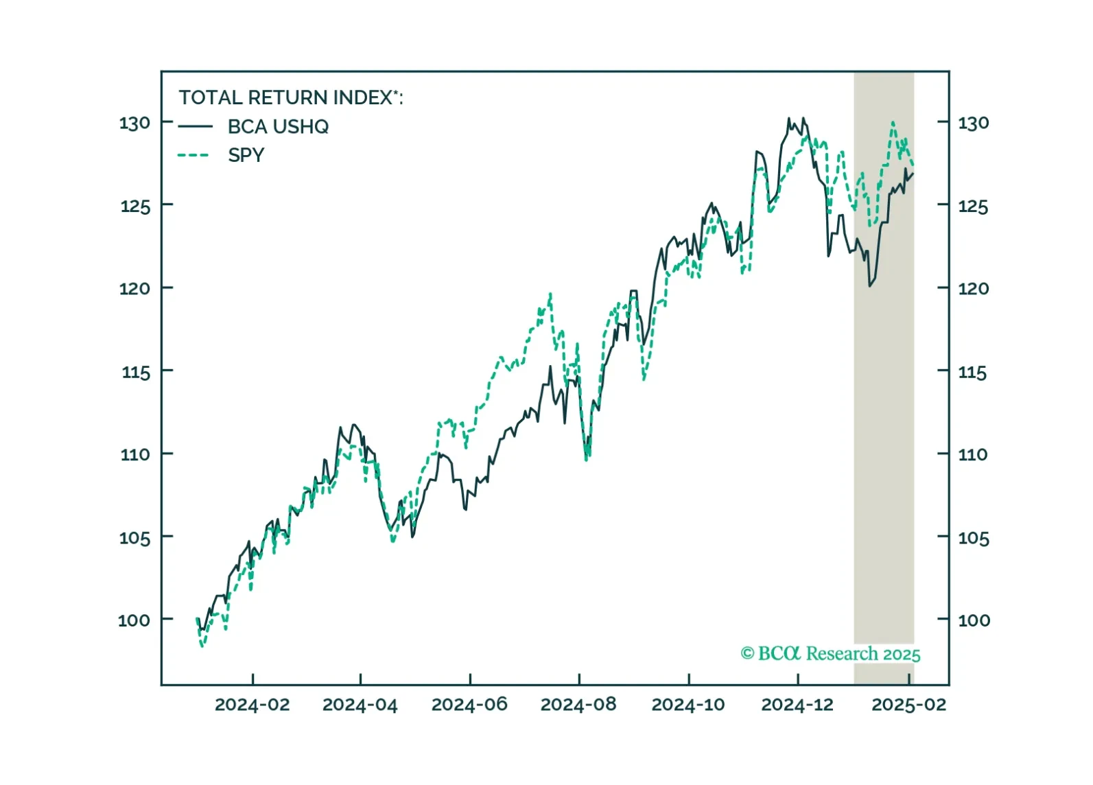The US High-Quality (USHQ) portfolio slightly outperformed in January, returning 3.4%, whilst its SPY benchmark returned 2.9%. That said, we think the USHQ portfolio will have a solid run through the first half of 2025, benefitting from rising market risk on the back of President Trump’s tariff agenda. USHQ’s underlying Quality and Safety Score factor tilts will be increasingly favored as market uncertainty grows.