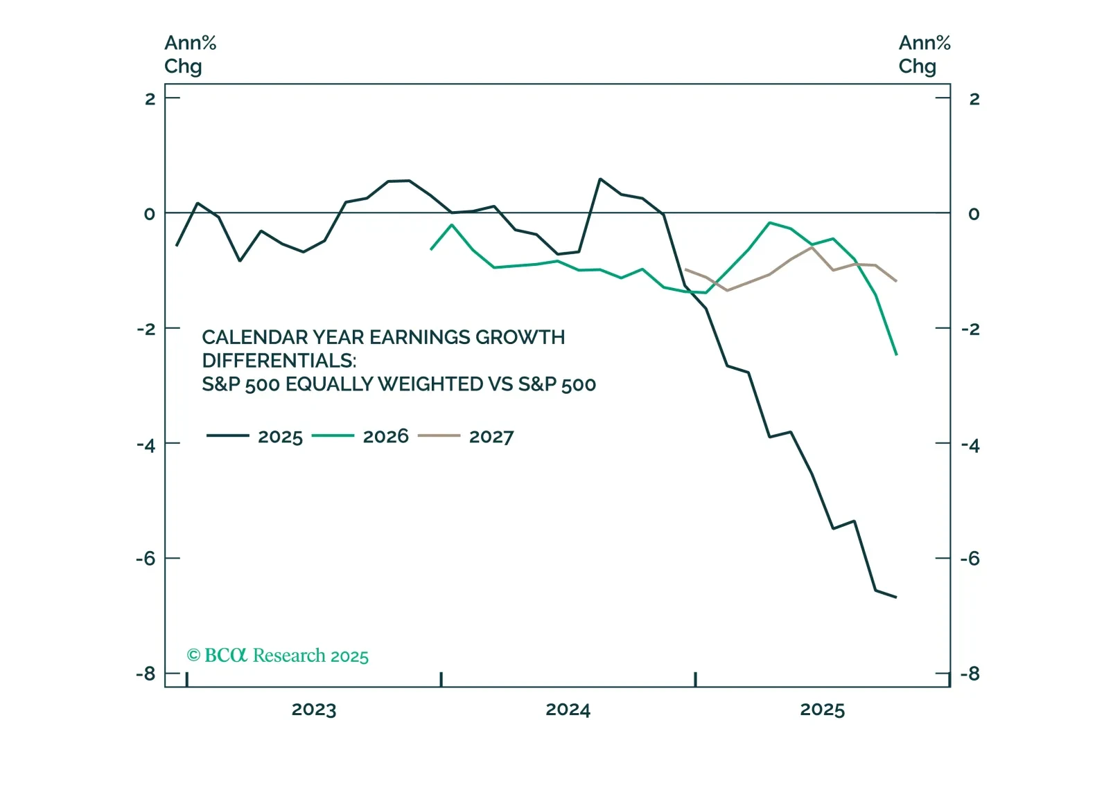 The outperformance of the S&P 500 relative to the S&P 500 EW index is likely to continue over the next year, supported by stronger earnings growth. However, extreme levels of market concentration will ultimately halt the outperformance of the mega-caps.