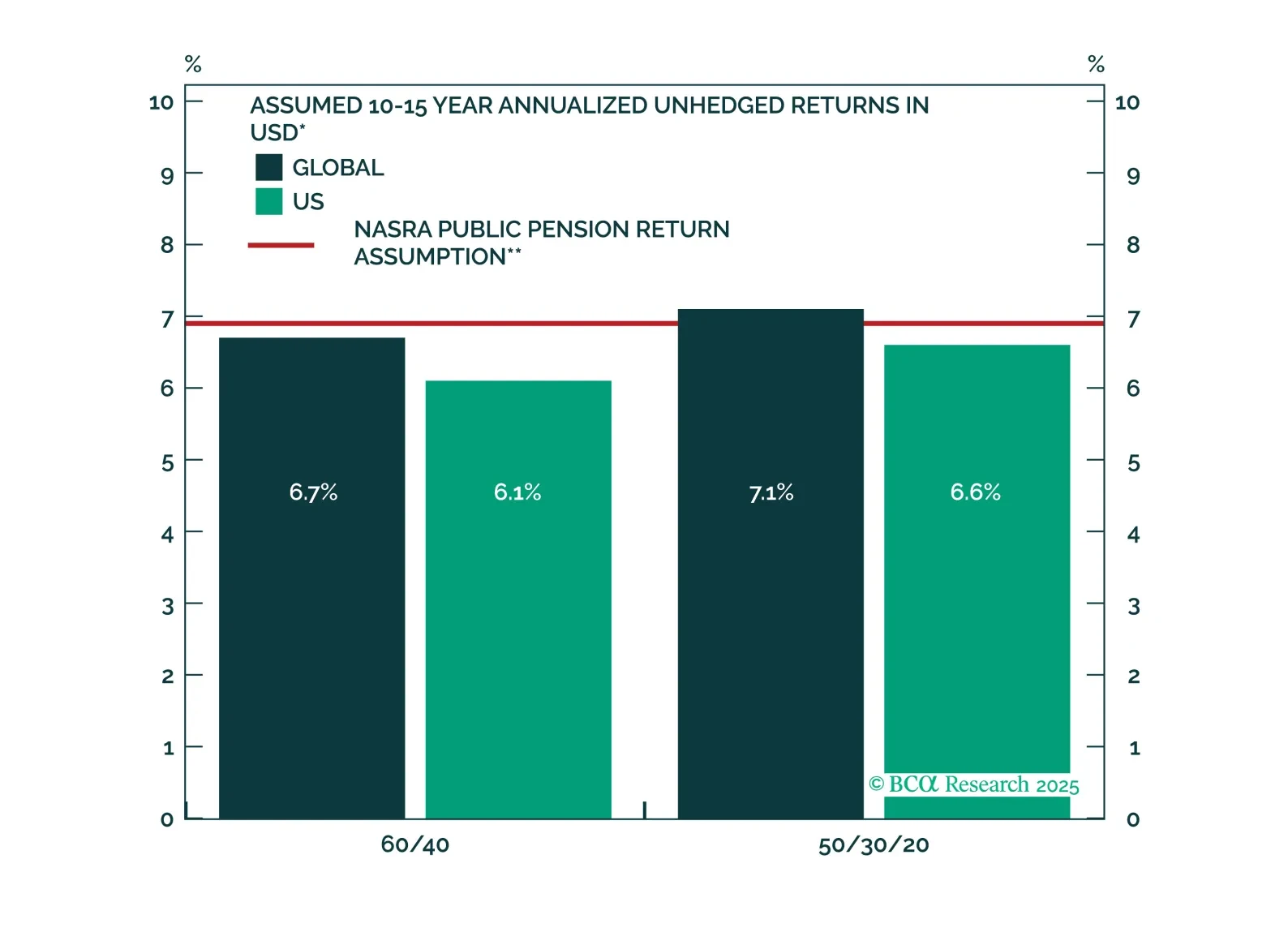 We revamp several of our methodologies in this edition of our return assumptions. We estimate that a US 60/40 portfolio will return 6.1% over the next 10 years. This is slightly below the return assumptions for US pension funds. Investors can obtain better returns by diversifying internationally and to alternative assets.
