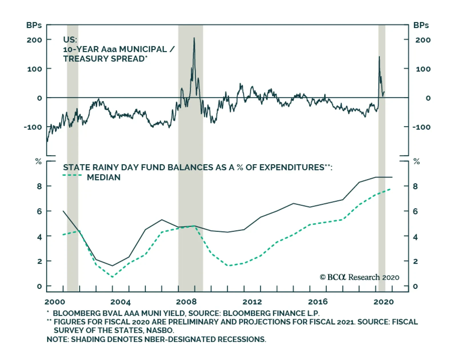For each credit rating, the rate available through the MLF is significantly higher than the actual market yield (Chart 8). This means that the MLF currently places a cap on how high municipal yields can rise, but it doesn’t actively pressure them lower. This stands in stark contrast to the rates offered through the Term Asset-Backed Securities Loan Facility (TALF) that are considerably below market yields on Aaa-rated CMBS and similar to market yields on Aaa-rated consumer ABS. Uncharitable MLF pricing structure aside, we think there are several reasons to remain overweight municipal bonds within US fixed income portfolios. First, the Fed is already facing criticism about the MLF rates and it could lower them in the near future. It has already shown a willingness to alter its facilities in response to market pressure. The MLF initially only made loans with maturities of 2 years or less, now it offers loans of up to 3 years. Second, direct federal aid to state & local governments was the centerpiece of the relief bill that recently passed through the House of Representatives. That bill will not get through the Senate in its current form, but another federal government relief package is forthcoming and it will almost certainly include money for state & local governments. There is even a strong case for tax-exempt municipal bonds relative to corporate bonds. Third, despite the massive challenges ahead, state governments entered the present crisis with relatively strong budget positions and well stocked rainy day funds (Chart 9). State & local governments will obviously be forced to make some tough budget decisions in the coming months, but there is no doubt that they are in a better position to do so than they were prior to the last two recessions. Chart 9State Rainy Day Funds
