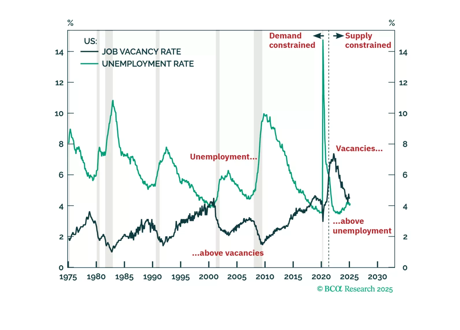 The US economy has never entered a demand-driven recession without labour demand running below labour supply and without the job vacancy rate running below the unemployment rate. Right now though, US labour demand is still running 1.7 million workers above labour supply, and the job vacancy rate is running comfortably above the unemployment rate. This suggests that the labour market is still supply-constrained, and that a demand-driven recession is not imminent. We discuss the investment implications. Plus, more about our ‘trade of the century’: long cotton versus coffee.