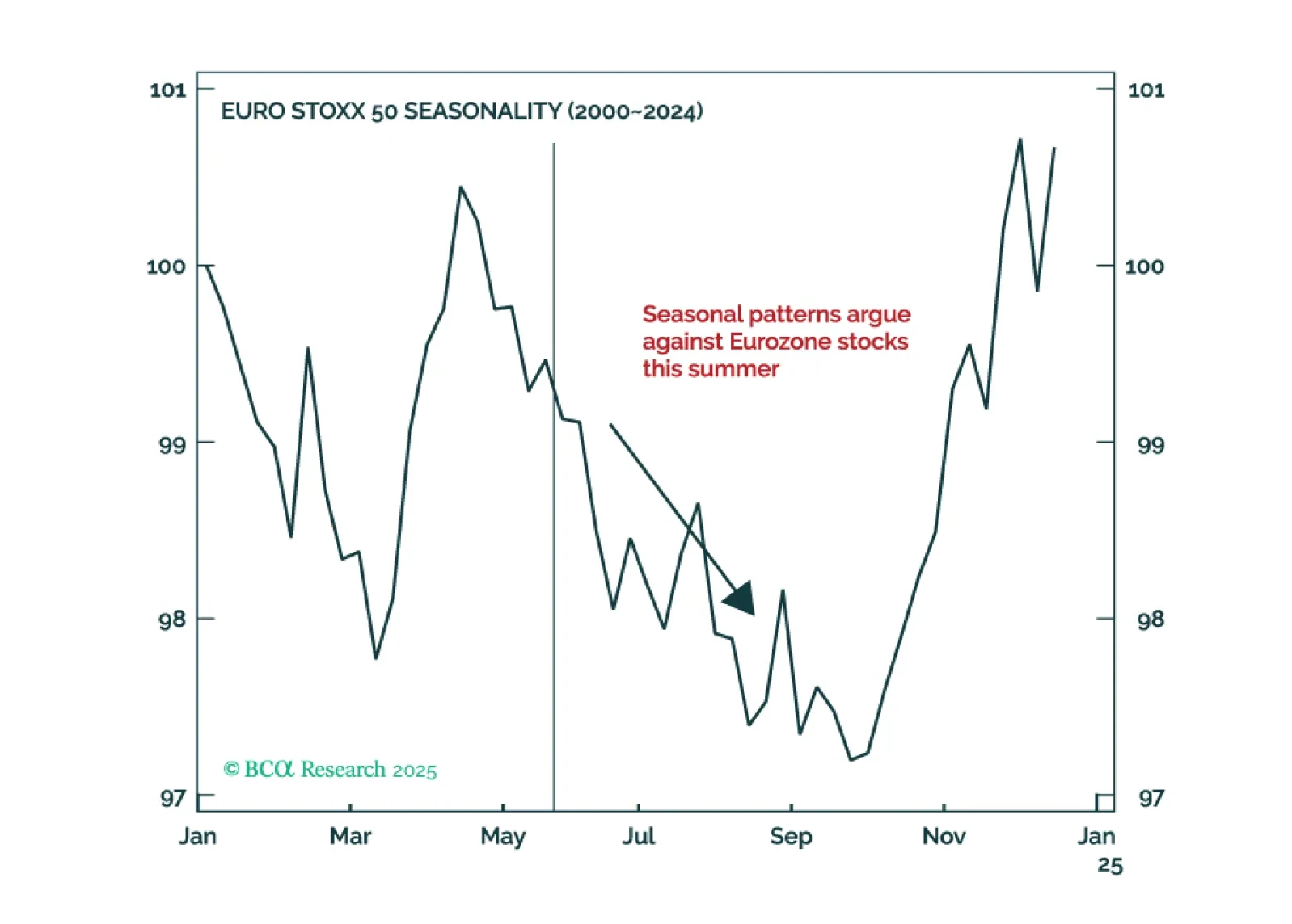 European equities will face a clash of powerful forces this summer. Expect sharp swings and false breaks, creating an ideal terrain for nimble traders but a minefield for buy-and-hold investors seeking steady gains.Within this backdrop, our stance remains unchanged: stay long value, short growth. Pair it with long core markets against the periphery and overweight domestically oriented names relative to exporters.EURO STOXX 50: Summer Range, Tactical Risks HighEuropean equities are boxed in: Powerful but evenly matched forces should trap the EURO  STOXX 50 between 4750 and 5500 through the summer, creating near-term tactical risks.Tailwinds Chart 1 Bombed Out Earnings Revisions Bombed Out Earnings Revisions Trade war pause. The White House’s recent climbdown shows that the administration is constrained. Once its actions endanger growth (and the odds of GOP victories), it will retreat. Extreme left tail risks have therefore narrowed. Because 22% of European corporate sales come from the US, lower recession odds there lift the expected value of Euro Area profits. Earnings revisions were already at panic levels that usually mark an interim EURO STOXX 50 trough, so the trade ceasefire supports prices in the coming months (Chart 1).End of US exceptionalism. Fiscal stimulus in the United States is ebbing. The average primary deficit ran at roughly 3.7% of  GDP from 2005 to 2015 and 4.5% from 2016 to 2024, creating an average fiscal thrust of 0.8% of GDP during the last decade. The Big Beautiful Budget Bill will result in an average primary deficit of 4.2% of GDP over the next ten years. As a result, the average fiscal thrust will fall to 0.25%, which will result in weaker US growth conditions. Tariffs, if they remain in place long-term, could even depress the thrust further as they constitute a tax on households. Europe, meanwhile, has put austerity behind it, and private sector deleveraging is over. The narrowing fiscal gap raises the expected return on the European capital stock relative to the US, a scenario that has often lifted Eurozone equities (Chart 2). Investors understand this change, and they are diversifying away from the US into Europe, which remains attractively priced in relative terms (Chart 3). Chart 2 Changing Fiscal Momentum Changing Fiscal Momentum Chart 3 Europe Remains Cheap Relative To U.S. Equities… Europe Remains Cheap Relative To U.S. Equities… HeadwindsValuations. Compared to Wall Street, Europe is inexpensive, but relative to its own history, it is rich. The MSCI Euro Area trades near the top of its forward P/E range at 13.6. Consensus also projects a solid 12 month EPS growth, leaving little valuation cushion (Chart 4).Margin risk. Forward margins sit near record levels at 8.7% (Chart 5). EU bound US tariffs have already risen to 25%, and an elevated EUR/CNY hands Chinese firms a competitive edge over European ones. Pricing power should weaken over the rest of 2025, pressuring margins lower. Chart 4 … But Not Relative To Its History … But Not Relative To Its History Chart 5 Excessive Margins Optimism Excessive Margins Optimism Rates. The latest FOMC minutes show a central bank fixated on the dangerous mix of elevated household inflation expectations and the threat of tariff driven inflation despite deteriorating US soft data (Chart 6). By refusing to ease, the Fed is falling behind the growth curve, which heightens the odds of a hard landing. Long yields are also a threat to European equities. BCA’s fixed income team shows that heavier net issuance and heightened inflation uncertainty are driving 10 and 30 year rates higher worldwide. A fatter term premium drags on growth and endangers inflated multiples. The pinch is sharpest in the US, however, European stocks sport a high beta that will echo any global equity pullback sparked by a skittish bond market (Chart 7). Chart 6 Fed Caught Between Inflation And Slowing Growth Fed Caught Between Inflation And Slowing Growth Chart 7 Europe’s High Beta Is A Threat Europe’s High Beta Is A Threat Chart 8 Entering The Dark Season Entering The Dark Season Balancing these forces, the EURO  STOXX  50 should oscillate between 4750 and 5500 through the summer. At today’s 5367 level, the index is a tactical sell, and seasonal patterns point in the same direction (Chart 8).Bottom Line: European equities will chop sideways until the push and pull between growing earnings risks and the trade war respite resolves. With the EURO STOXX  50 hovering near the top of its 4750–5500 corridor, trim exposure and lean on relative trades. Wait for margins to reset and global yields to settle before adding directional risk.Relative Value Playbook for a Range Bound MarketIn a directionless but volatile market, alpha lives in relative value. For the summer, we prefer three pair trades: long core equities against the periphery, long value against growth, and long domestically focused names against exporters.Long Core/Short PeripheryPeripheral equities have been all the rage lately, beating core markets by  29% since early 2024. Yet in 2025, their price surge has outpaced earnings, and the gap between relative performance and relative EPS growth is now extreme (Chart 9). PMIs in the periphery are also sliding versus the core (Chart 10). The set up argues for a rotation back into core benchmarks. Chart 9 The Peripheral Stocks Have Dissociated From EPS… The Peripheral Stocks Have Dissociated From EPS… Chart 10 … And Growth Momentum Is Worsening … And Growth Momentum Is Worsening Long Value/Growth StocksEuropean value stocks still sell at an abnormal discount of 50% to growth stocks, compared to a median discount of 34% since 2003 (Chart 11). Year to date, value has been the strongest-performing factor in Europe, rising by  17%. Meanwhile, growth has been the worst-performing factor in Europe, rising by only 6%. Attractive valuations, combined with improving momentum, should keep the bid 