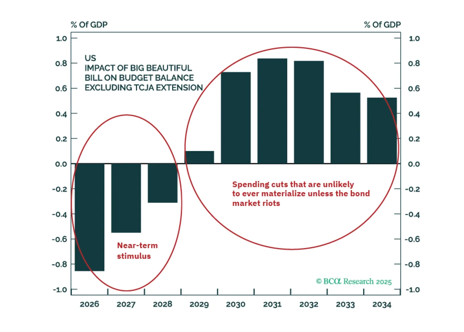 President Trump’s big beautiful bill will pass but faces near-term hurdles and will not tighten the government’s belt. It will combine with renewed tariff implementation to generate near-term risk for both the bond and stock market. The Iran crisis fizzled, saving Trump from a major oil shock that could have derailed his second term.