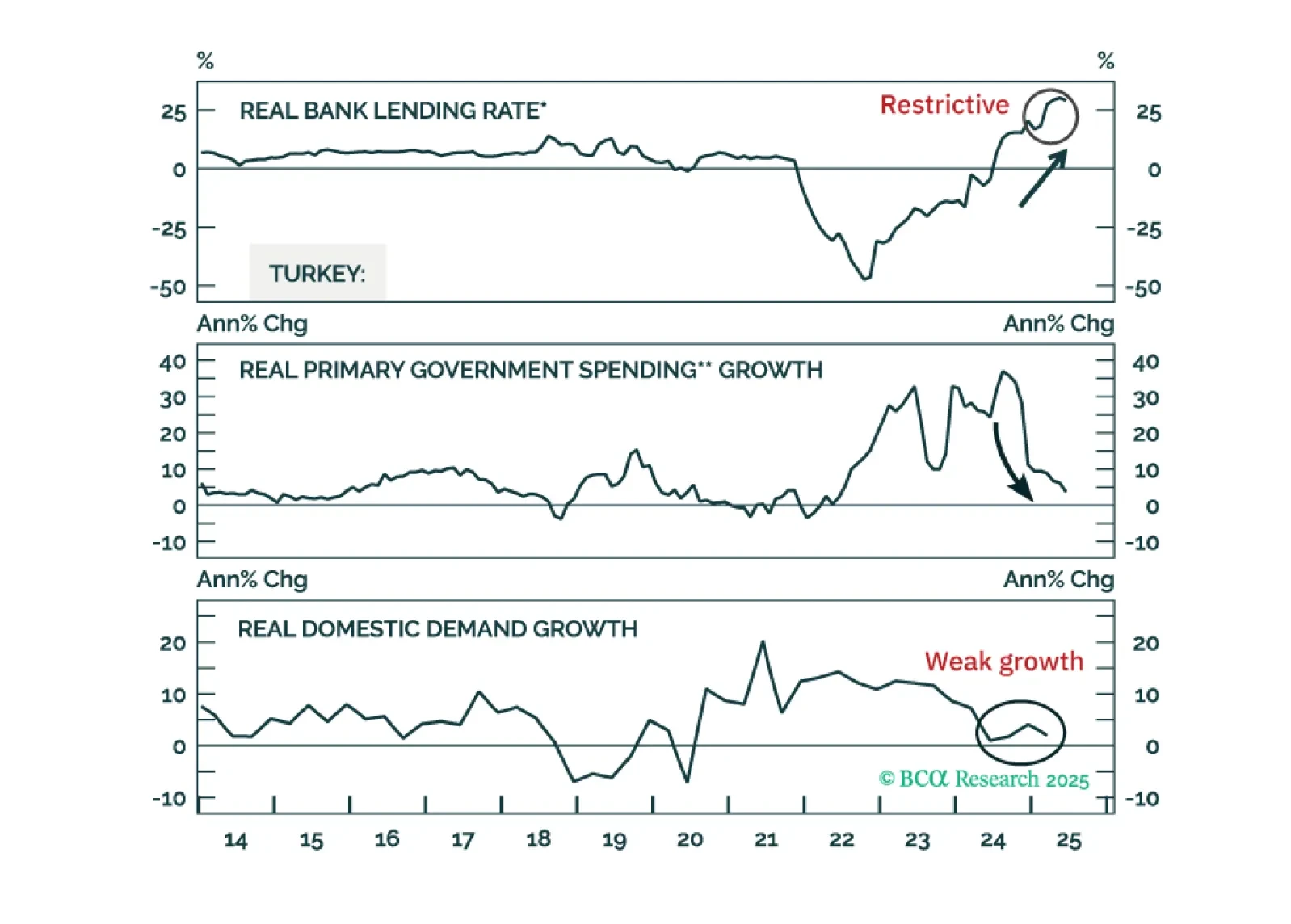 Turkey’s financial policymakers have pursued a disciplined and restrictive policy mix so far, delivering high real interest rates and curbing fiscal expansion even as the economy slows. This commitment to inflation control has paved the way for a pronounced decline in price pressures, prompting BCA’s Emerging Markets Strategy team to upgrade Turkish domestic bonds to overweight in its EM domestic bond portfolio. Similarly, Moody’s has recently upgraded Turkey’s credit rating and outlook. The lagged effects of the restrictive stance are now increasingly evident: real bank lending rates hover near 30%, real domestic demand growth is decelerating, and fiscal expenditure increases are barely keeping pace with inflation. Collectively, these conditions point to further disinflation and declining bond yields in the coming quarters (Chart 1).From an FX strategy perspective, the Turkish lira (TRY) presents a less precarious profile than many fear and what the forward markets currently imply.
