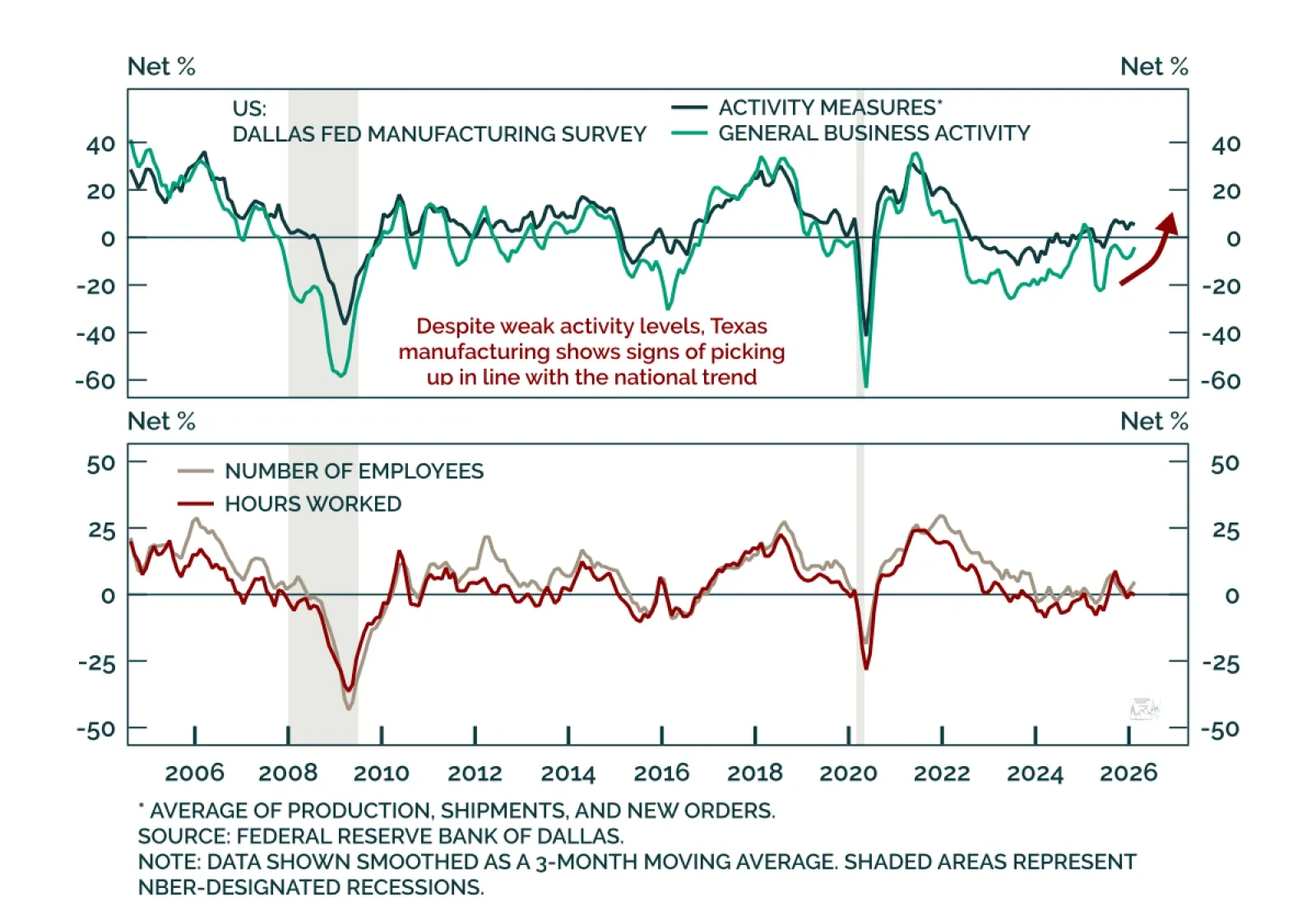 The Dallas Fed survey points to strengthening manufacturing activity alongside moderating price pressures. The headline index rose to 0.2 from -1.2, beating estimates and marking the strongest reading since July 2025, though still at a low level. The index…