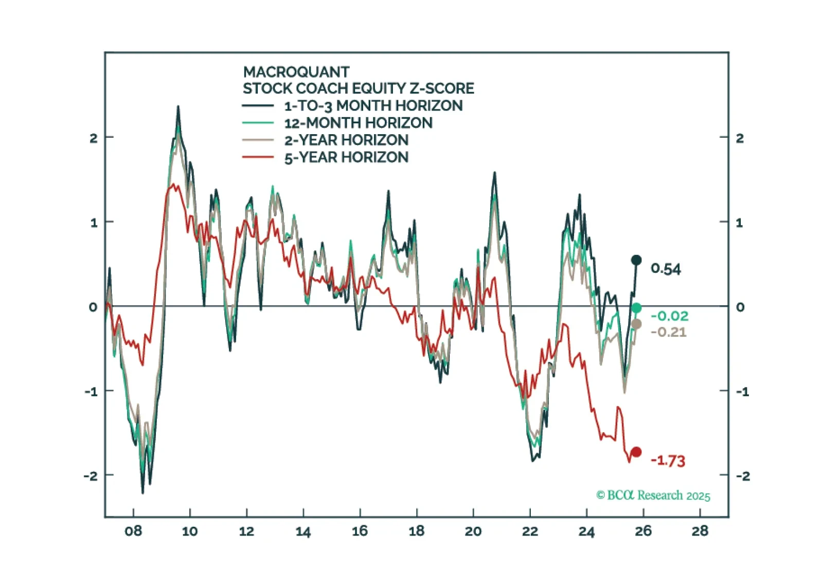 MacroQuant is tactically overweight equities, favors an above-benchmark duration stance in fixed-income portfolios, remains bearish on the US dollar, and is bullish on gold and copper.
